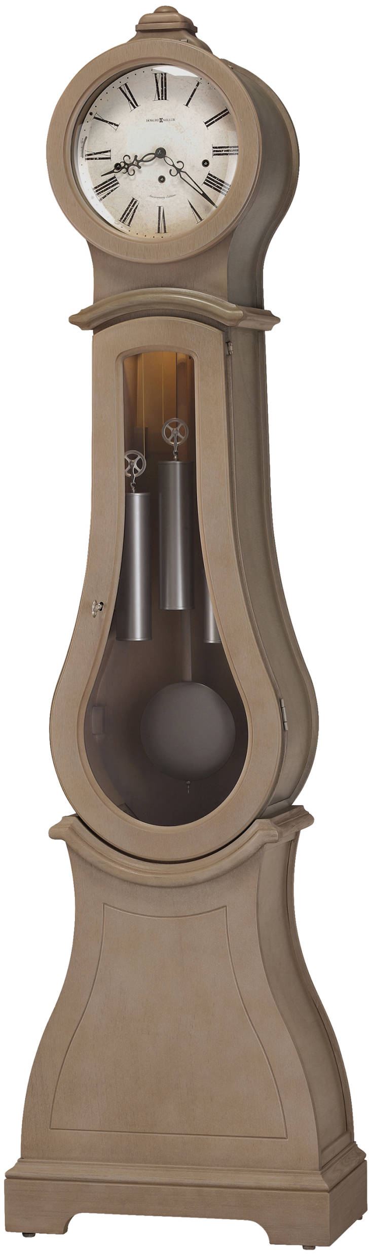 Hinged, locking front mid door features a glass window and offers a view of the aged nickel finished weight shells and pendulum. The pendulum bob is finished in aged nickel with a wood stick that matches the case.
