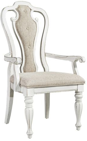 Sit in comfort with the Magnolia Manor splat back upholstered arm chair. Finished in an antique white with heavy chipping and crafted of rubberwood solids, the upholstered back is button tufted in a chenille fabric laced with tones of white, tan and brown threads. The splat back is accented with the dog bone carvings while the arms are slightly curved for a comfortable fit. The seat flows into beautifully faceted turned legs with nylon chair glides.Read More