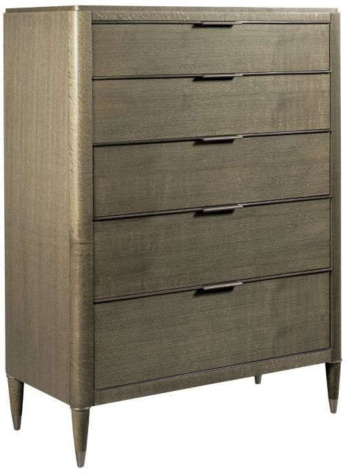 Maxwell drawer chest is a great addition to any bedroom. Drawer chest is scaled for smaller footprint but tall for maximum of storage. Five drawers with bottom one cedar lined and bronze nickel trim and hardware finish out the look with the tapered legs.