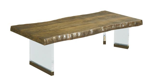 The Brevard coffee table is destined to be the conversation piece of the living room. It incorporates several trending elements like brushed gold-tone metal accents, thick acrylic legs, and a live-edge effect on the top making this one hot coffee table!