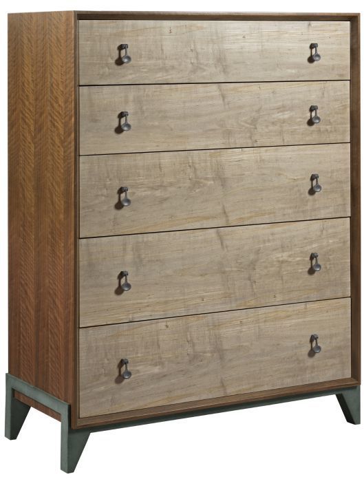 Walnut & Ambrosia Maple. Motif drawer chest is a great addition for a storage option with five drawers. Framed walnut end panels with ambrosia maple drawer fronts makes this a contemporary feel along with the beautifully sculptured metal base.