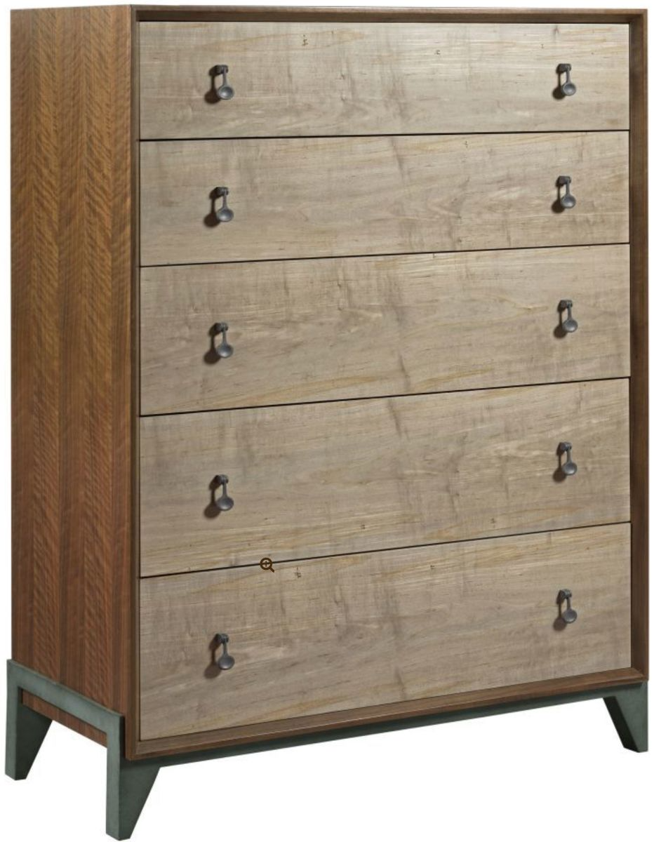Motif drawer chest is a great addition for a storage option with five drawers. Framed walnut end panels with ambrosia maple drawer fronts makes this a contemporary feel along with the beautifully sculptured metal base.