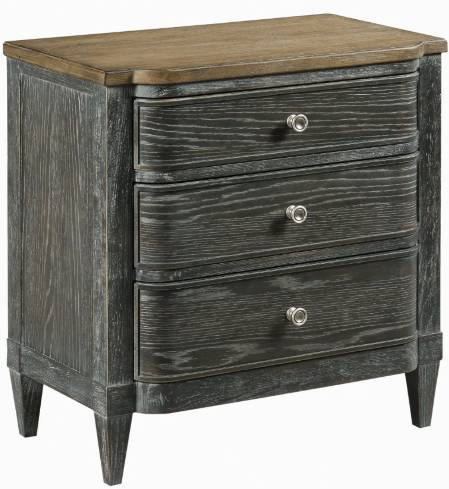 Inspired by French Neoclassical design, Ardennes features the primary shapes of that classic period but leaves the more ornate details behind. The result is an updated, casual style that blends perfectly with today's home. It is made using wire brushed White Oak that is finished in a Black Forest finish on the cabinets and bases with contrasting tops finished in a Brindle tone. Notable design elements include shaped drawers, tapered feet, neoclassical chairs, and antique mirror accents on several pieces.Read More