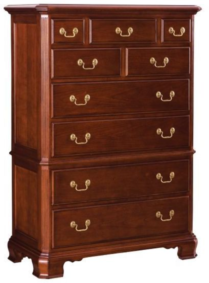 Drawer Chest comes with nine drawers, bracket feet, reeded pilasters, framed end panels making it a classic in this 18th Century style group. Georgian, Edwardian, Sheraton along with Queen Anne elements create this beautiful assortment of furniture. Cathedral cherry veneers, rubberwood solids and select hardwoods create an exciting collection of bedroom and dining room from American Drew.Read More