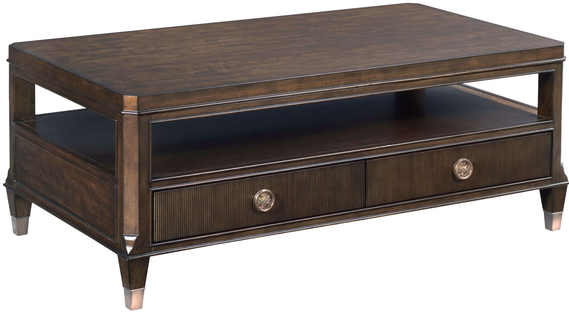 Cocktail table with shape, metal ferrules and awesome custom designed hardware will make this perfect for any setting.Read More