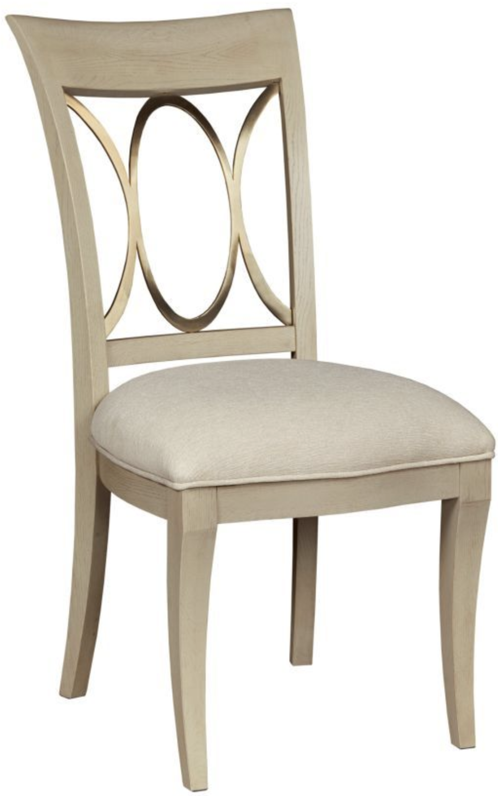This dining chair features an elegant theme of royalty. Details like light upholstery and gentle curving give to this transitional piece a touch of glamour.