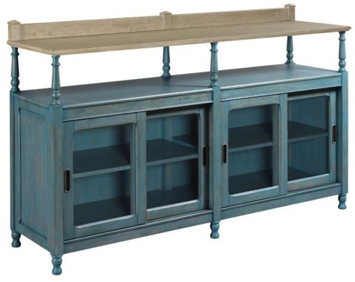 The collection features thick oak veneers in a driftwood finish against the soft texture of sun-washed paint. Metal elements along with accents of denim blue and natural, woven cane add to the personality.Read More