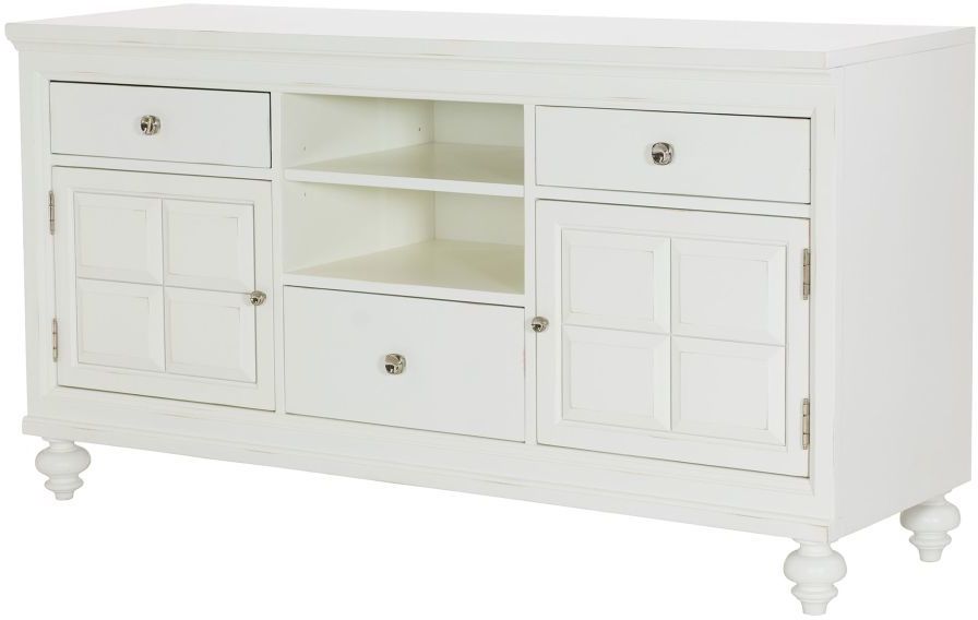 The Lynn Haven collection is a fresh take casual that blends clean traditional lines with seaside cottage influences. The Dover White finish of this collection is enhanced with worn edges and slight antiquing. Each item with drawers comes with two sets of hardware pulls allowing for a bit of customization. A square with circle motif chrome pull or a basic painted pull that matches the white finish. The scroll pattern detail in top drawers, doors, chairs and beds bring a delicate use of pattern that accents today's relaxed lifestyles. Lynn Haven is a whole home collection for the bedroom, dining room, kitchen and even the family room with occasional tables and entertainment pieces.