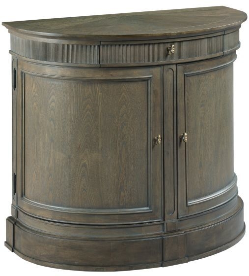 Beautifully shaped demi-lune bachelor chest has two doors with an adjustable shelf for storage in a mocha finish.