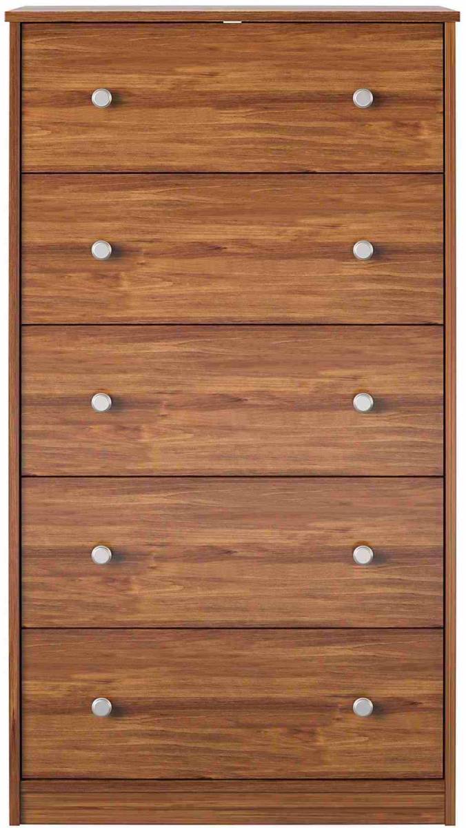 Organize your clothing and keep your bedroom tidy with a space-saving Tall 5 Drawer Dresser. Available in several traditional woodgrain finishes on laminated particleboard, the Dresser fits into any style. The 5 drawers feature durable metal slides to neatly store jeans, tees and more. Each drawer is finished in a smooth paper to keep your clothes from snagging on raw edges. A wall anchor kit is included to prevent tipping injuries and keep your family safe.