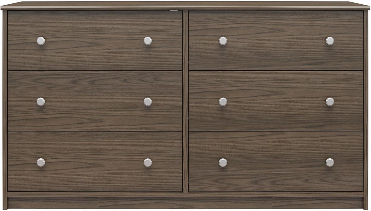 Add more storage to your bedroom or guest room with a Wide 6 Drawer Dresser. Available in several neutral finishes on laminated particleboard, the wide dresser adds a classic touch to your room that can easily fit into your existing décor. The 6 spacious drawers allow plenty of storage for your folded t-shirts, pants, sweaters, and even coats and extra linens. Display photos, decorations or jewelry on the large top surface. The linen look finish on the inside of every drawer keeps your clothes from snagging on raw edges. A wall anchor kit is included with the Dresser to prevent tipping injuries and keep your family safe.