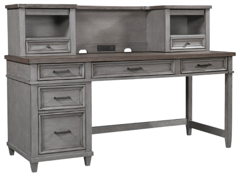 The aspenhome® Caraway Aged Slate Single Ped Desk with Hutch and Return offers a functional workspace with ample storage. Featuring a spacious desktop, integrated hutch for organizing essentials, and a return for additional workspace, this desk is perfect for enhancing productivity in any home office.Read More