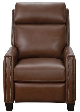 Push thru the arms low leg recliner with 44.9” high semi-attached pub back design, loose welted box seat cushion with pocketed coil springs encased in foam, wrapped in Dacron with a feather blend topper, footrest extension, nailhead trim accents, and tapered wood legs finished in a warm mahogany finish.Read More