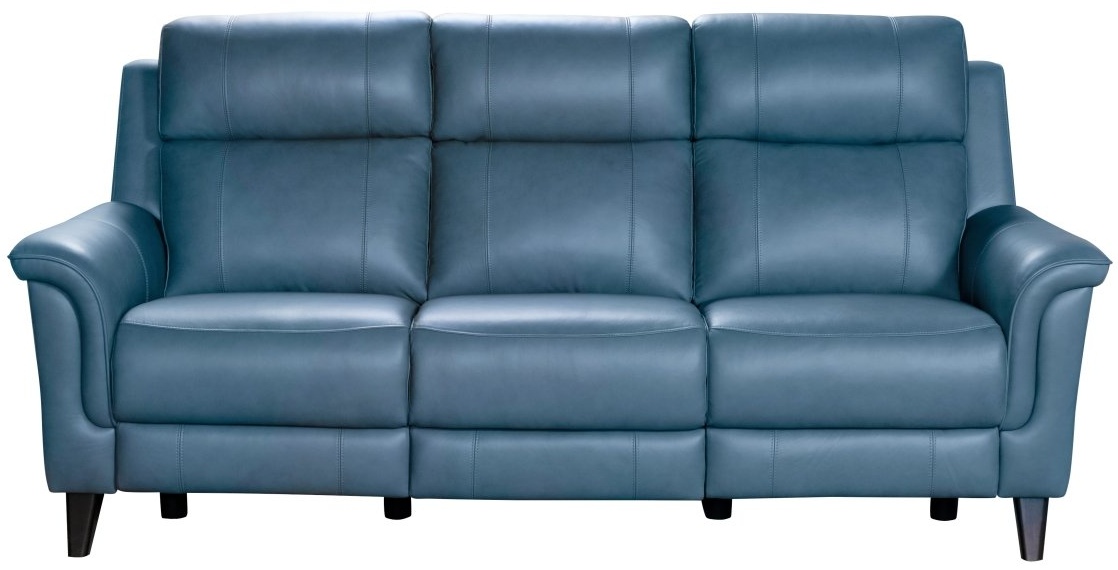 Mid-century modern elevated reclining sofa group with power recline and power headrest. This sofa features box seat styled pad over chaise seating with pocketed coil springs, tucked pillow arms, and clean line pub backs. Power buttons have USB ports to keep your devices charged. Matching loveseat and recliner available. Legs are finished in a dark teak colour.