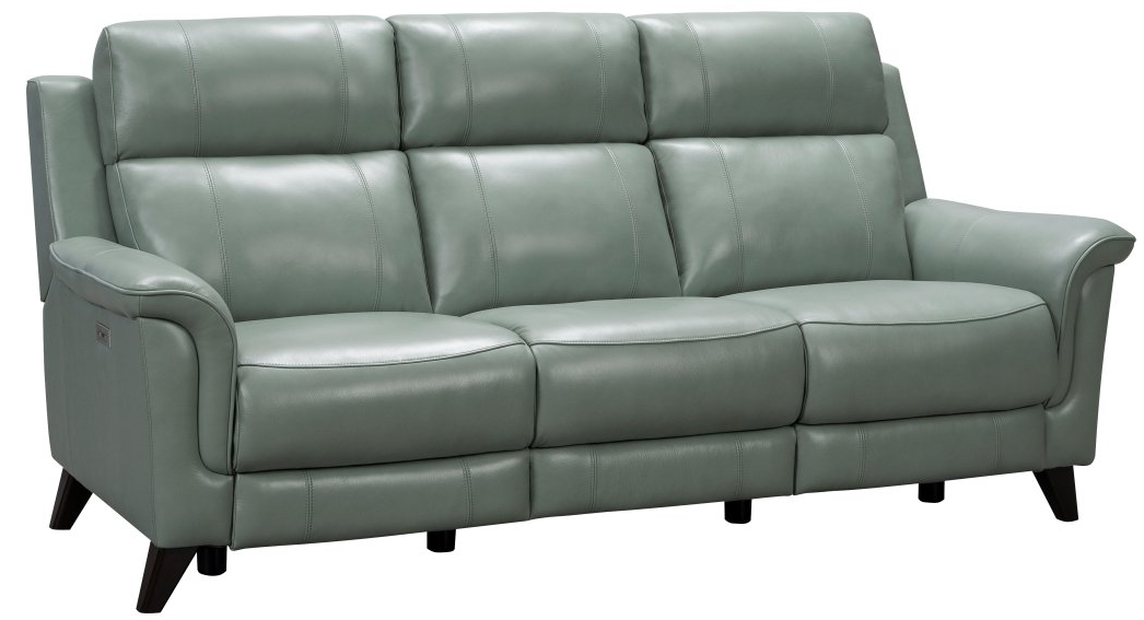 Mid-century modern elevated reclining sofa group with power recline and power headrest. This group features box seat styled pad over chaise seating with pocketed coil springs, tucked pillow arms, and clean line pub backs. Power buttons have USB ports to keep your devices charged. Matching loveseat and recliner available. Legs are finished in a dark teak colour.Read More