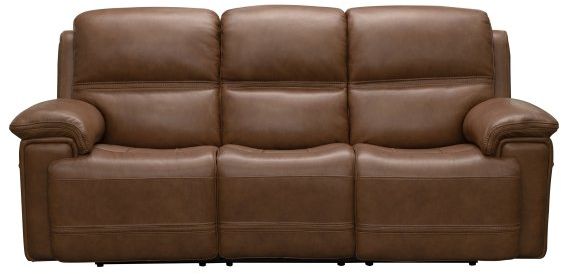 The BarcaLounger© Sedrick Spence Caramel Reclining Sofa features leather upholstery and powered reclining ability and headrests. This is part of a larger Sedrick reclining set.