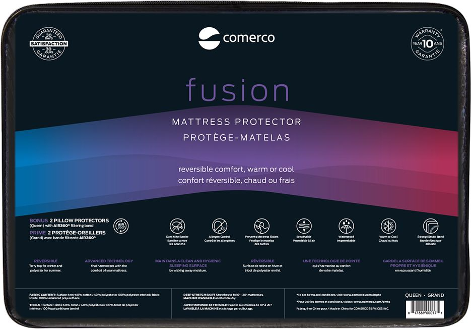 Choose the best in comfort and protection with Comerco's Fusion mattress protector. Designed to adapt to every season, this reversible mattress protector offers a cozy terry surface for winter and a cool polyester knit for summer. 100% waterproof and breathable, it provides a clean and healthy sleep surface.Read More