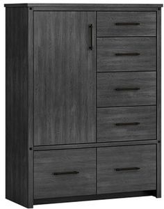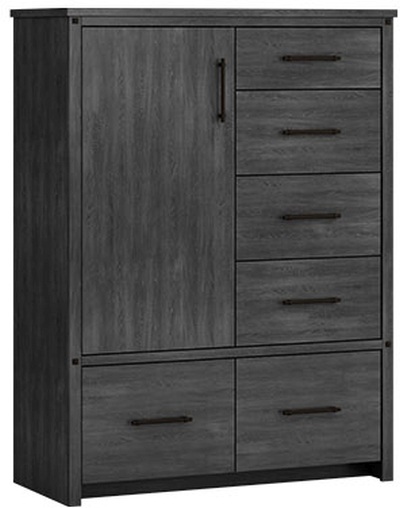The Sterling Armoire has a moody, driftwood laminate finish and black handles. This armoire is made with durable laminates on all surfaces with fully finished snag-free drawer boxes.Read More