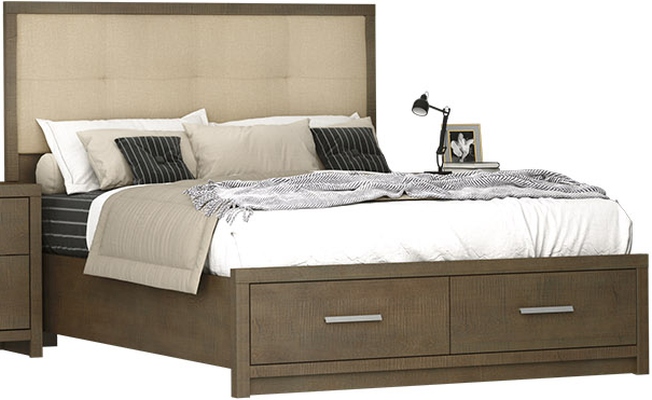 The Windsor Queen Panel Bed has a deep, prairie storm finish on maple with an upholstered headboard and brushed gold metal handles. This collection is made with durable maple veneers and laminates on all surfaces with fully finished snag-free drawer boxes.Read More