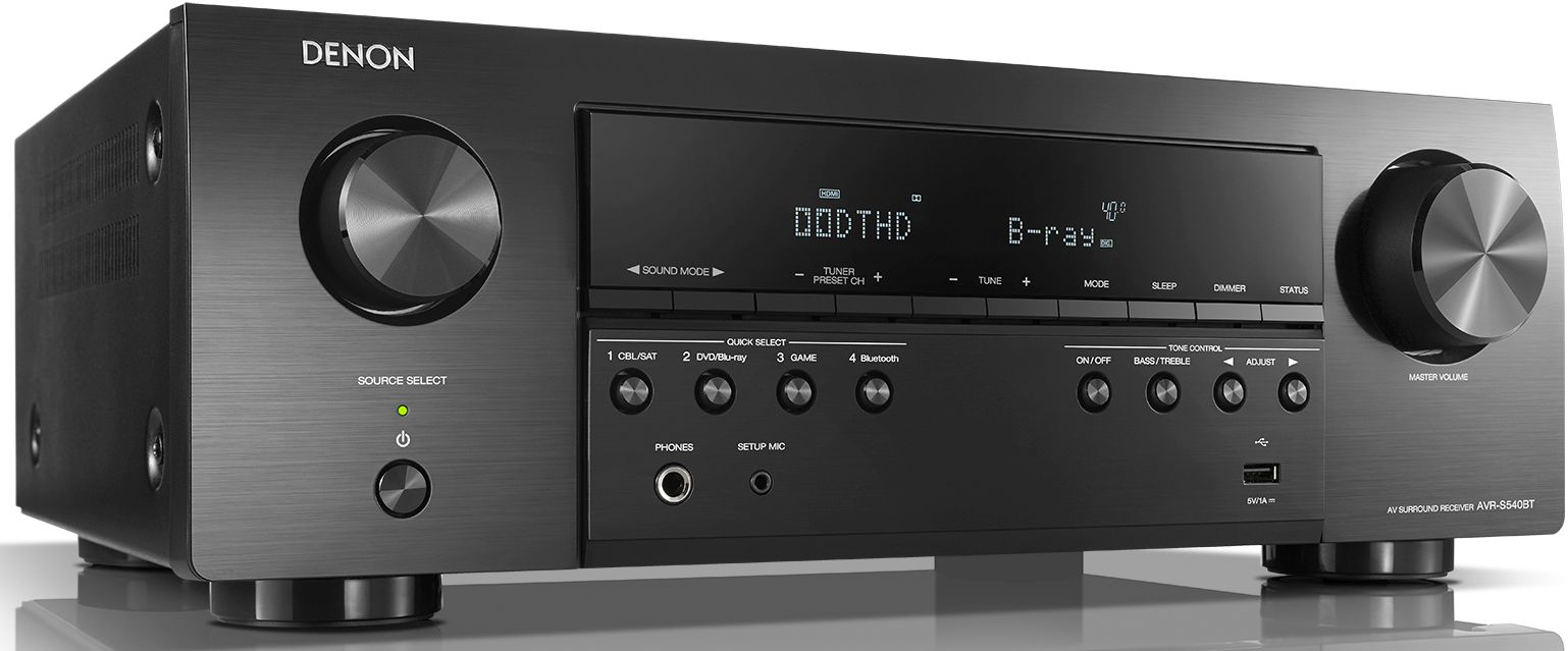 The 5.2 channel AVR-S540BT features Dolby Vision™, HDR, HLG and 4K Ultra HD video pass-thru with 5 HDMI inputs / 1 output. Stream your favourite music tracks wirelessly via Bluetooth. With our award-winning Denon Setup Assistant, the Denon AVR-S540BT is just as easy to setup as it is to enjoy.Read More