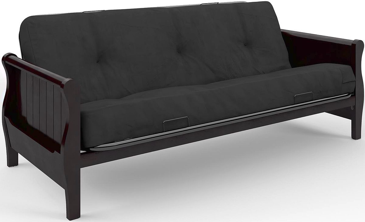 Featuring solid wood arms with an espresso finish, it will surely compliment any room décor. This futon quickly and easily converts from sofa to full size bed to help you sleep or sit in ample comfort. This mattress is built to hold up to everyday use.Read More