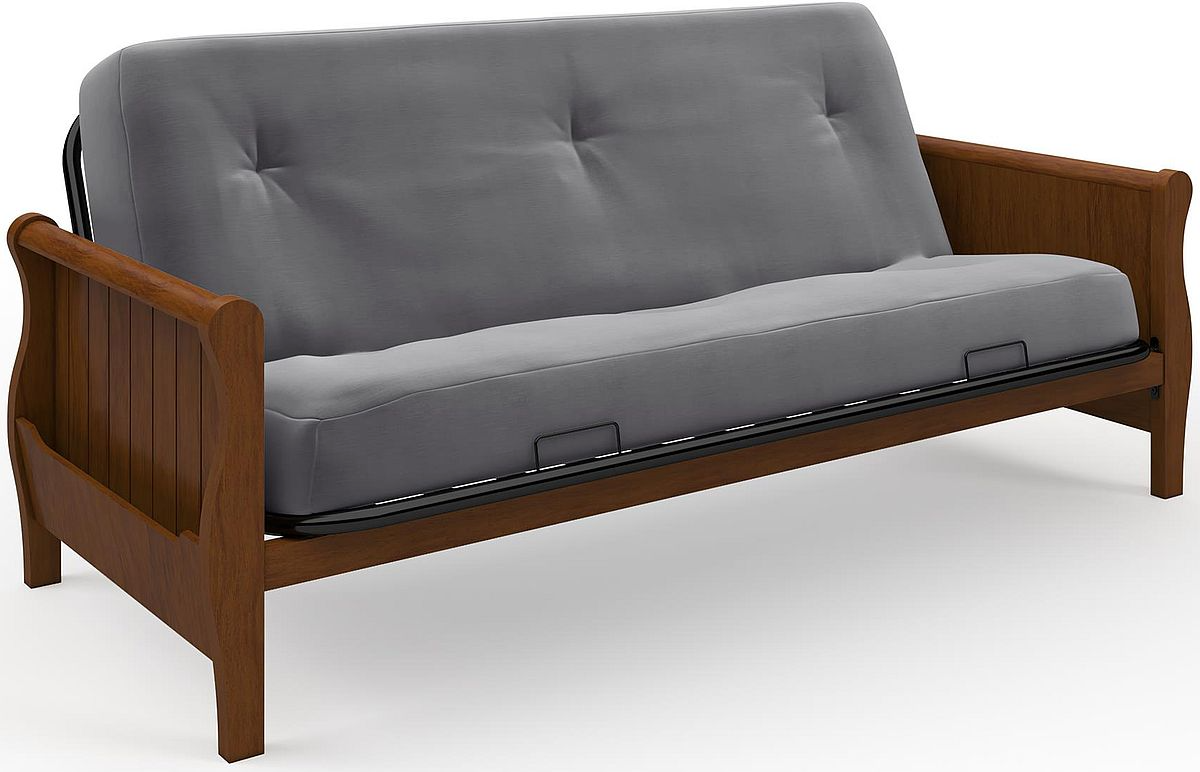 Featuring solid wood arms in your choice of either walnut or espresso finishes with a full size metal frame; the futon will enhance any room décor and includes side pockets for storage.