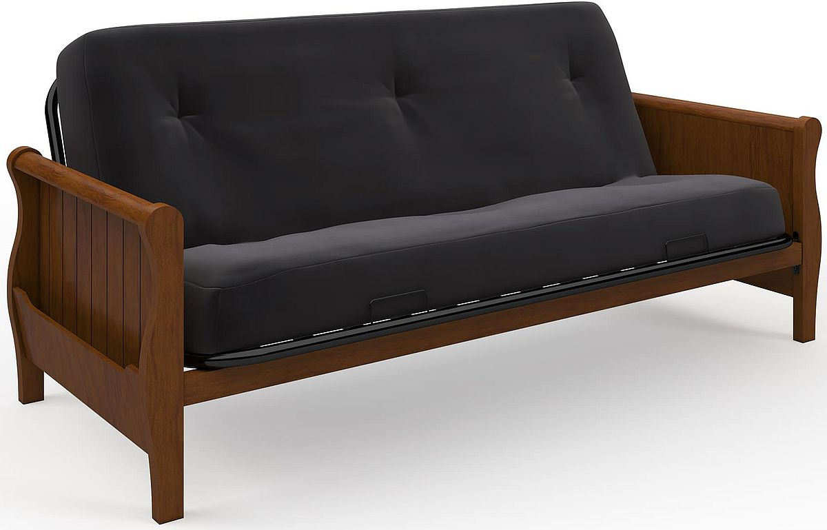Featuring solid wood arms in your choice of either walnut or espresso finishes with a full size metal frame; the futon will enhance any room décor and includes side pockets for storage.