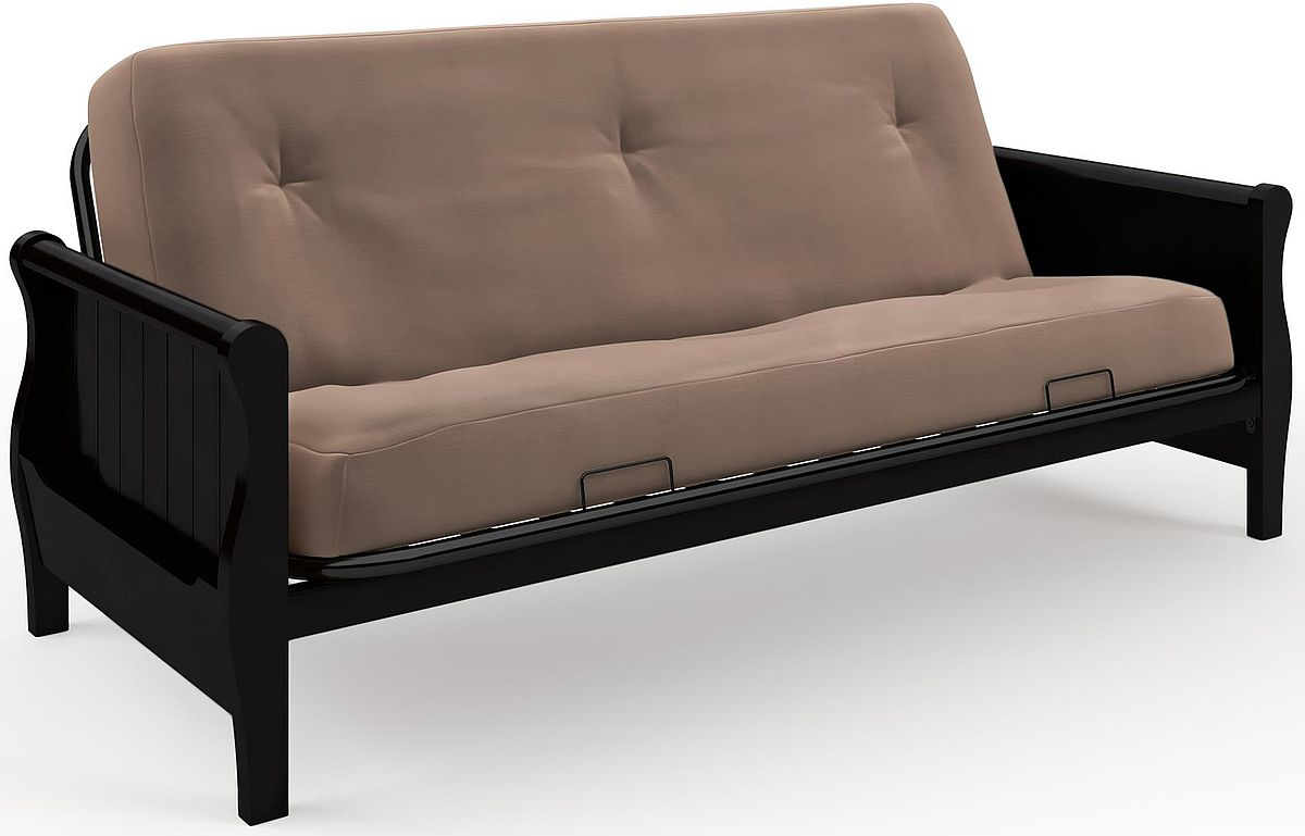 Featuring solid wood arms in your choice of either walnut or espresso finishes with a full size metal frame; the futon will enhance any room décor and includes side pockets for storage.