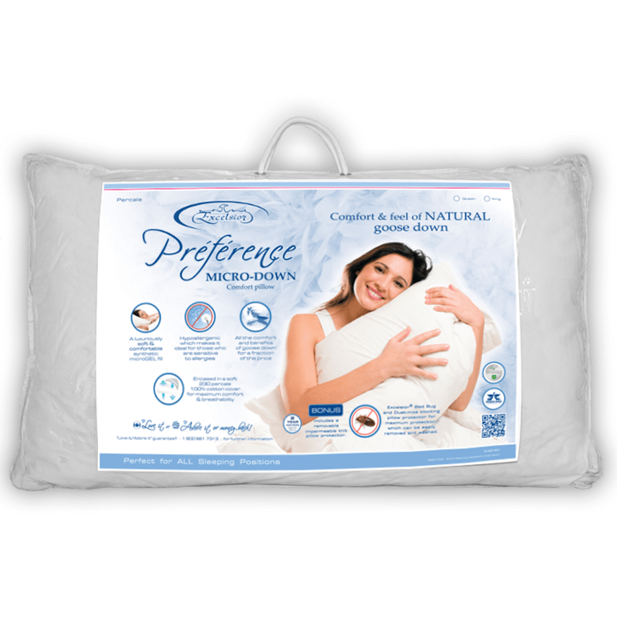 The Micro-down pillow has a luxuriously soft and comfortable synthetic microgel fill that has the comfort and feel of natural goose down. It is hypoallergenic which makes it ideal for those who are sensitive to allergies while providing the comfort and benefits of goose down for a fraction of the cost. The Micro-down pillow comes encased in a soft 230 percale 100% cotton cover for maximum comfort and breathability. As an added bonus, it includes an Excelsior Bed Bug and dust-mite blocking pillow protector for maximum protection, which can be easily removed and washed.