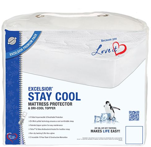 The Stay Cool Mattress Protector makes life easy! It features a patented zipper system for easy maintenance and dry wick technology that provides a cool, comfortable sleep. It's fully breathable, comes treated with Teflon™ and Silver Antimicrobial. PLUS it has the features of the Invincible! It's perfect for use during the Spring and Summer seasons, and a favourite of women in the 50+ crowd. It also comes with an Exclusive ALL Stain coverage and our 30 Day Love it/Adore it Guarantee!