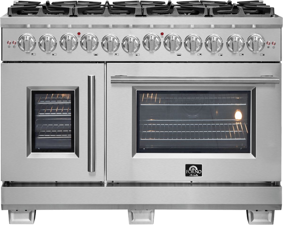 The 48” Forno Capriasca French Door Dual Duel Range brings professional styling and Performance into your home kitchen with its durable stainless-steel design. The gas rangetop has 8 sealed dual-ring brass burners with a total output of 160,000 BTU for simmering melting chocolate or cooking sauces.Read More