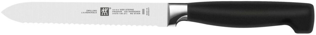 The seamless transition from bolster to handle makes Four Star knives comfortable for long periods of use. The bolster provides the right balance while acting as a safe finger guard. Made in Germany. The ZWILLING Four Star Serrated Utility Knife is perfect for slicing foods with a tough exterior and soft interior like tomatoes, sausage, cheese and rolls.