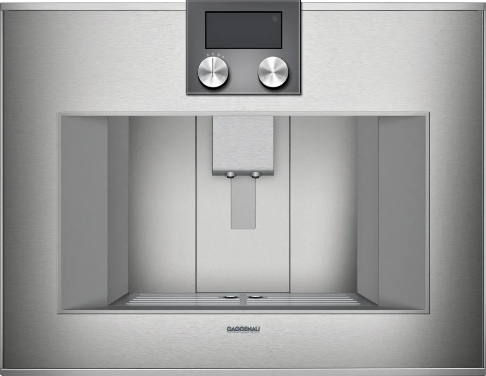 Gaggenau 400 Series Fully Automatic Espresso Machine-Stainless Steel with child lock safety and 7 light settings. Continuous flow heater means no waiting time and constant brewing temperature. Aroma brewing technology for a full aroma. Handleless door/automatic door opening.Read More