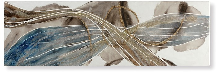 Make a statement in your space with this gallery worthy abstract piece in hues of blue, gray and brown with shimmering gold and silver accents. Stretched canvas over a fir wood frame.Read More