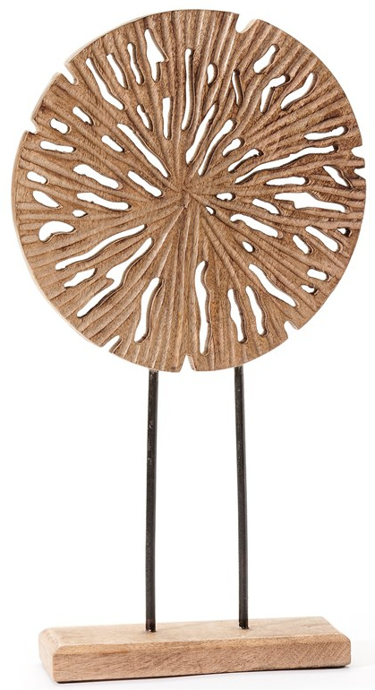 This unique table décor piece features a global and an eye-catching design. Rustic, but with a modern twist, this piece features sculpted wood on metal pins with a sturdy rectangular base.Read More