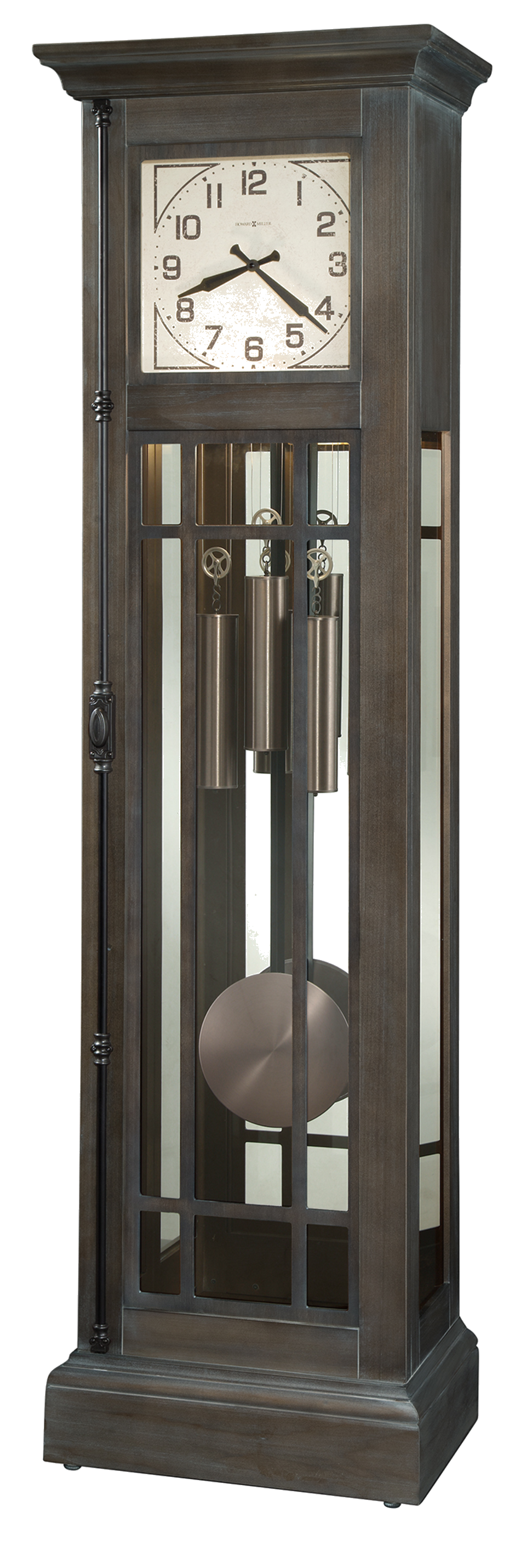 Blackened steel finished decorative weight shells and pendulum bob, which hangs on an iron-finished metal stick. A faux front door features an iron-finished gun barrel latch and glass panes framed by wood mullions, revealing a mirrored back panel. The dial and case are illuminated, with an easy to reach roller switch on the back.