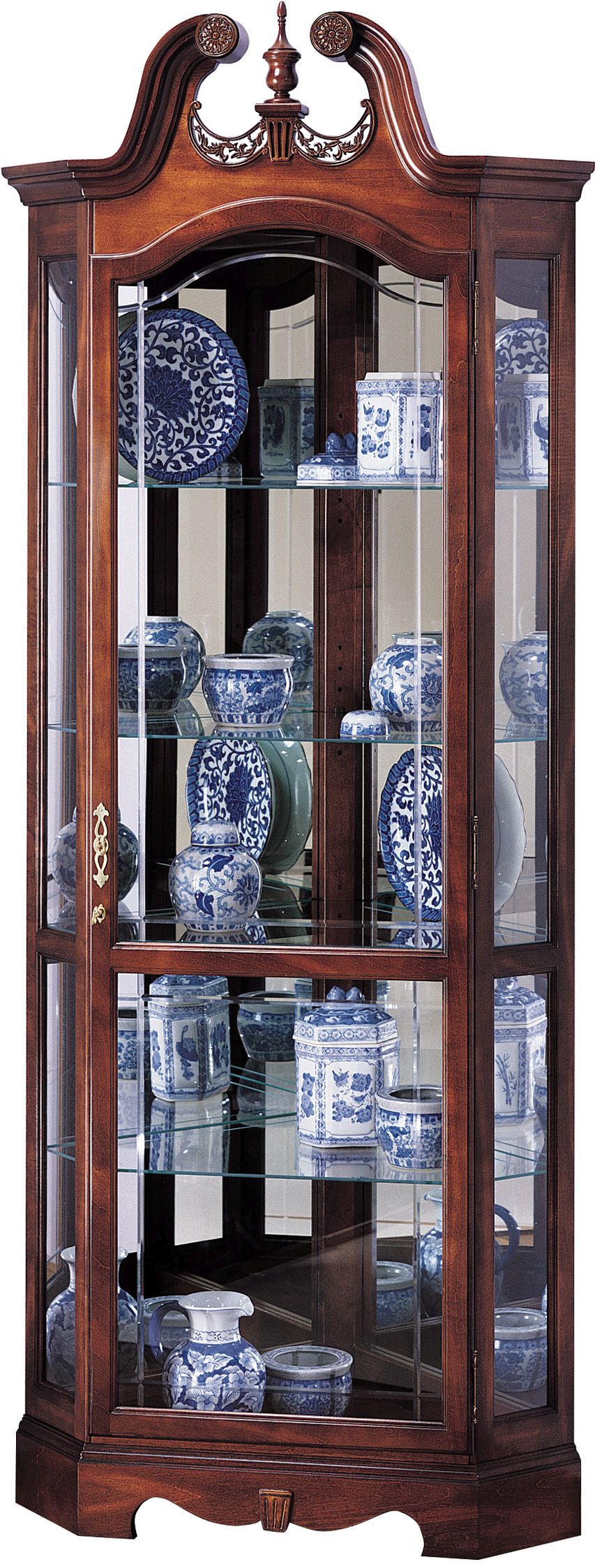 This is a Curio cabinet in the corner. A decorative pierced overlay, two rosettes and a keystone in the center accentuate the swan neck pediment. On the door, crystal-cut grooved glass follows the pediment curves. Finished on selected hardwoods and veneers in Windsor Cherry.Read More