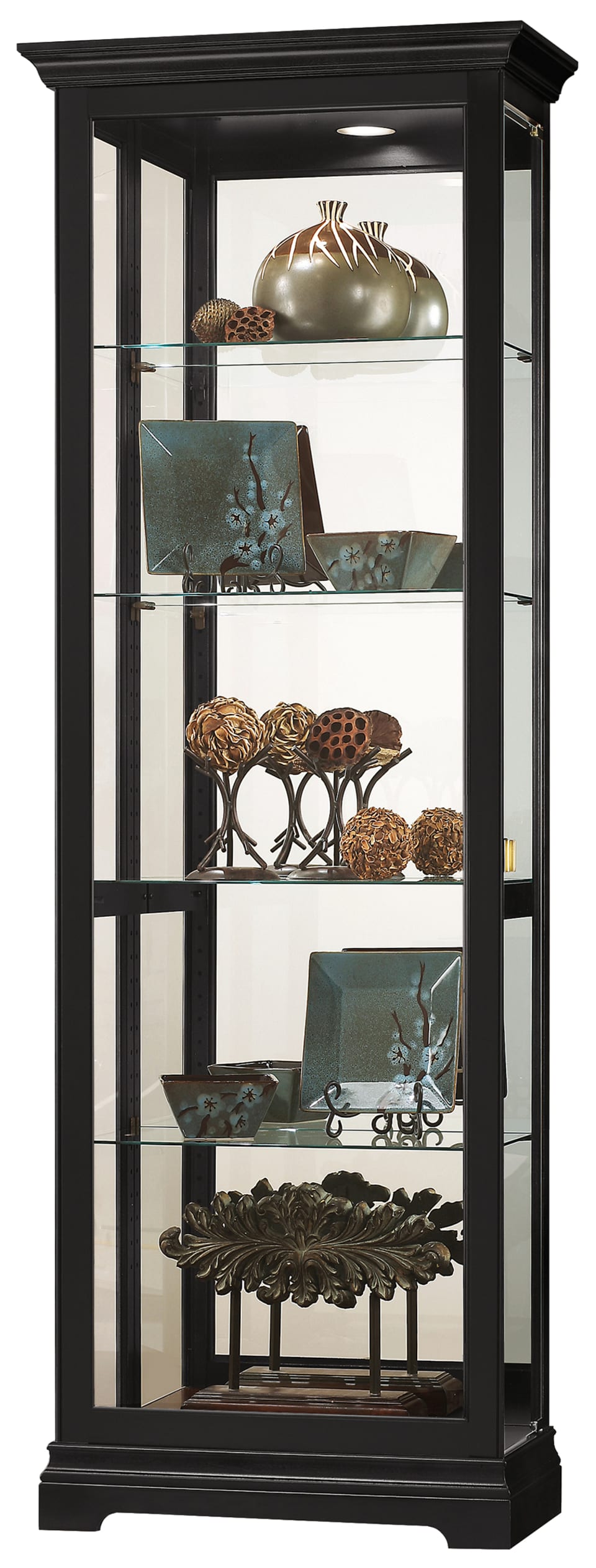 Features four adjustable glass shelves with continuous holes for shelf adjustment. A glass mirrored back enhances the view and adjustable levelers under each corner provide stability on uneven and carpeted floors.