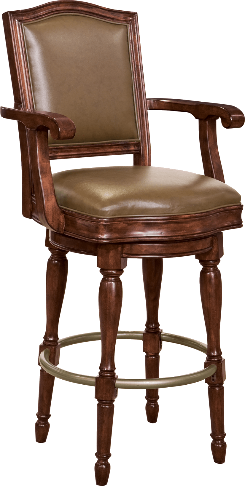 This swivel bar stool features a brown faux leather seat cushion and back rest and an antique brass-tone footrest. Finished in lightly distressed Hampton Cherry on select hardwoods.Read More