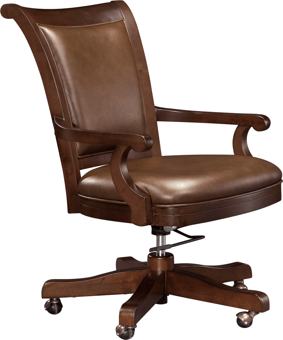 This Club Chair has a brown faux leather seat cushion and back rest. Wood-covered, metal base with ball castors. Weight capacity is 300 lbs.Read More