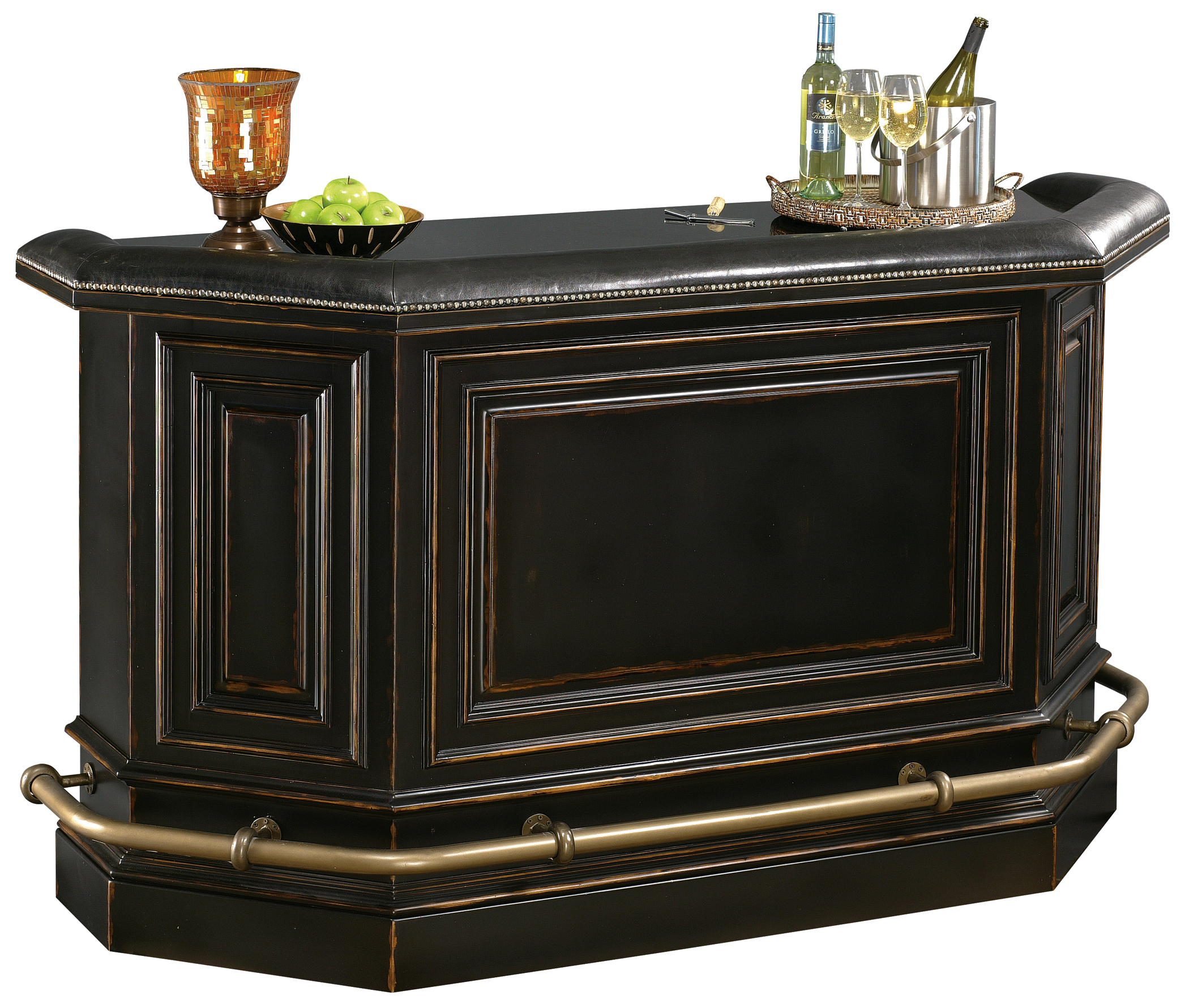 This raised panel bar is finished in Burnished Black on select hardwoods and veneers, and features a worn look. Includes a black faux leather armrest, accentuated with antique brass nailheads. A one-piece sparkle, black granite top and an antique brass-finished metal footrest. The framed panel detail continues to the backside door and drawer moldings.Read More