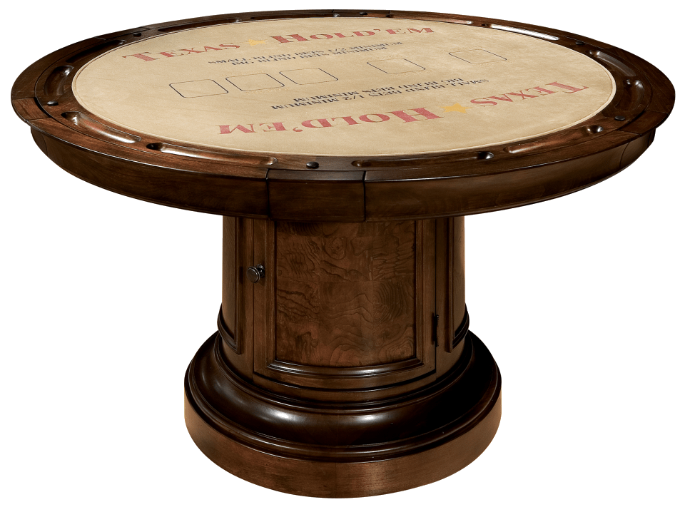 The reversible/removable top features rare olive ash burl veneers on the dining surface side and a fabric poker-playing surface on the other
