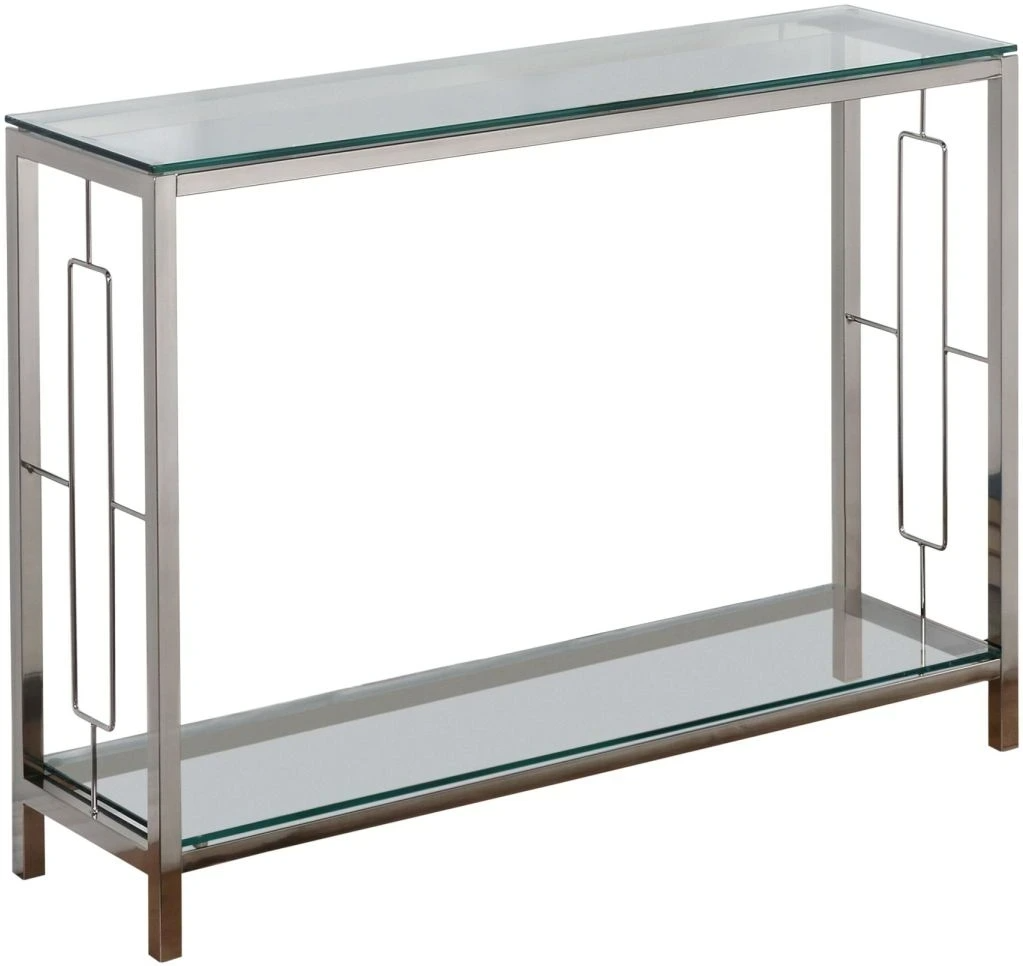 A beautiful chrome finish and clear glass shelves come together to create a modern table that is the perfect accent piece in any room. Two tiers for extra storage space. Use this table in a hallway, dining room, or front entryway.Read More
