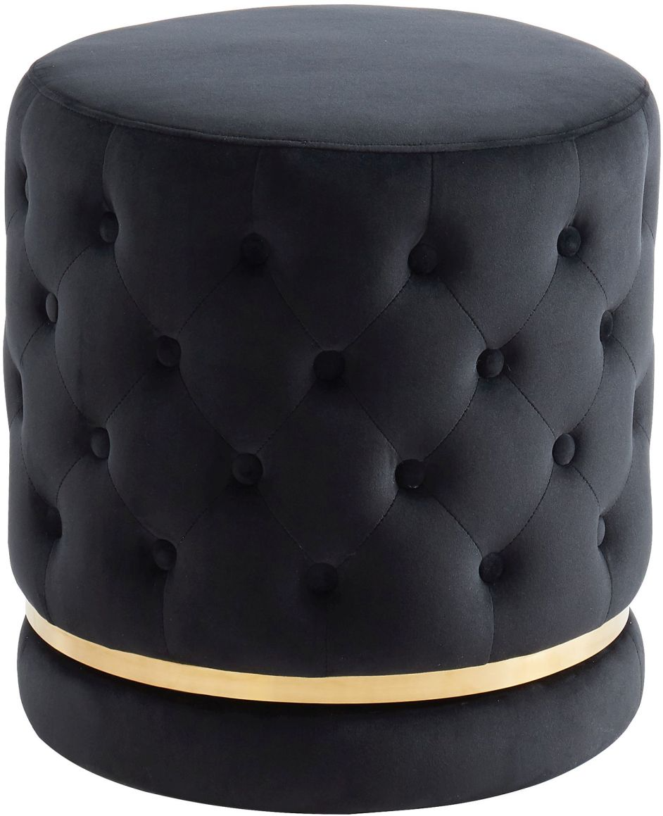 Make a big style statement with this gorgeous velvet-upholstered ottoman. The diamond-patterned button tufting and the gold metal accent combine to create a piece that will elevate any space. The larger diameter means you can easily use as a side table by the sofa, a night table in the bedroom, an ottoman in the living room, or even as extra seating in the dining room. Medium seat firmness will lend hours of comfort or support for whatever your purpose.Read More