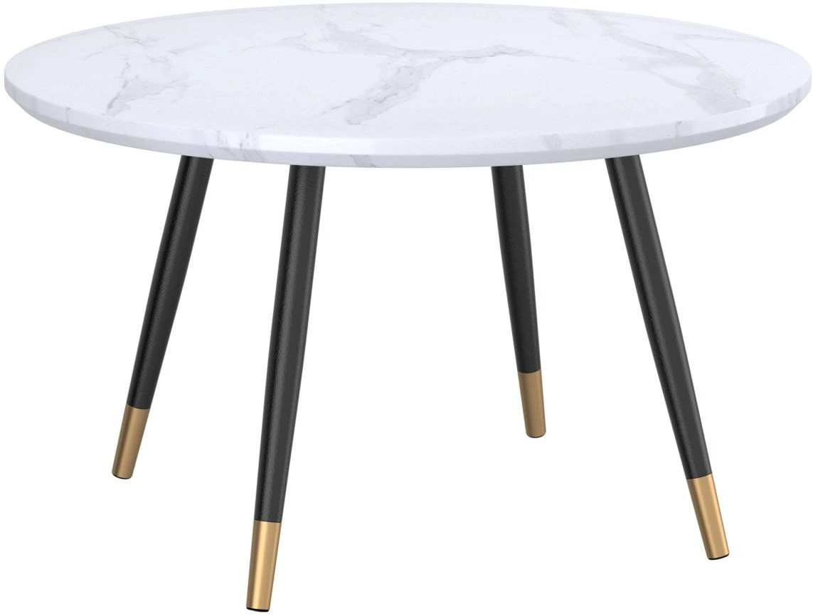 Clean, contemporary, marble-look accent table brings a true designer feel to your space. The A-line black metal legs have an aged gold accent that elevates this piece to couture status. Perfect for formal or casual living spaces.Read More