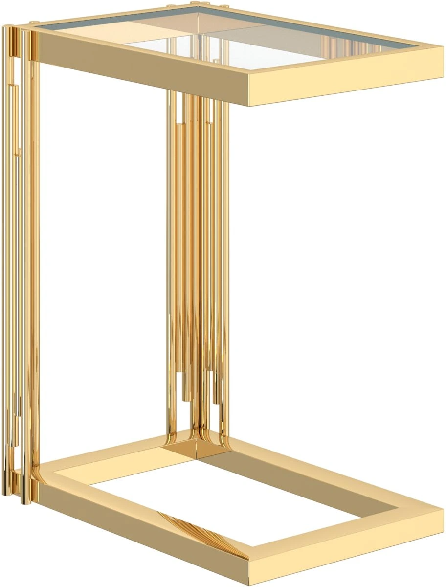 Contemporary table with some Art Deco-inspired style. The polished metal frame and clear glass top will bring instant shine to any room. The open c-style design allows this table to be pulled right up to the sofa or chair - a convenient wine glass holder!Read More