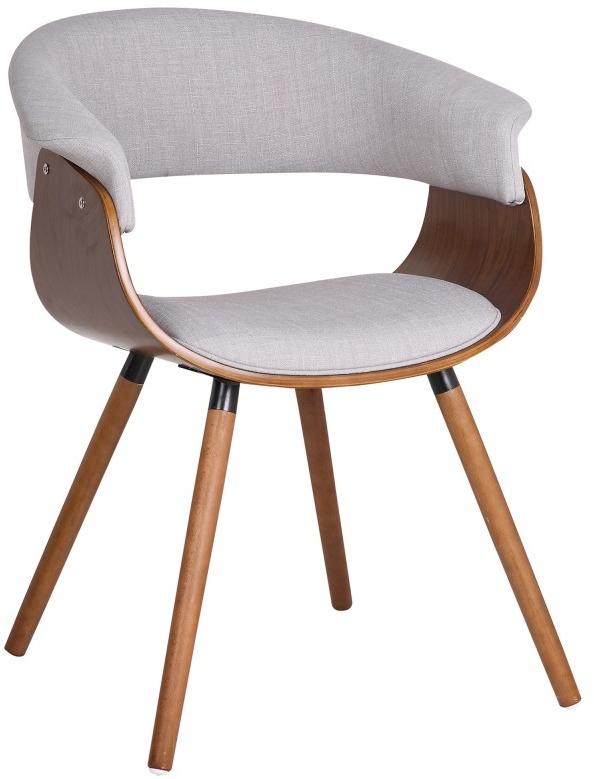 Utilizing a curved bentwood frame and solid rubber wood legs in a rich walnut finish, the structure of this chair will be quick to catch even the most critical eye with its appealing flair. The mid-century modern styling is finished with light grey fabric, embellished with piping details. This chair is perfectly suited to pair with any style of dining table, or to hold its own as an accent piece in a living room, hallway, or bedroom.Read More