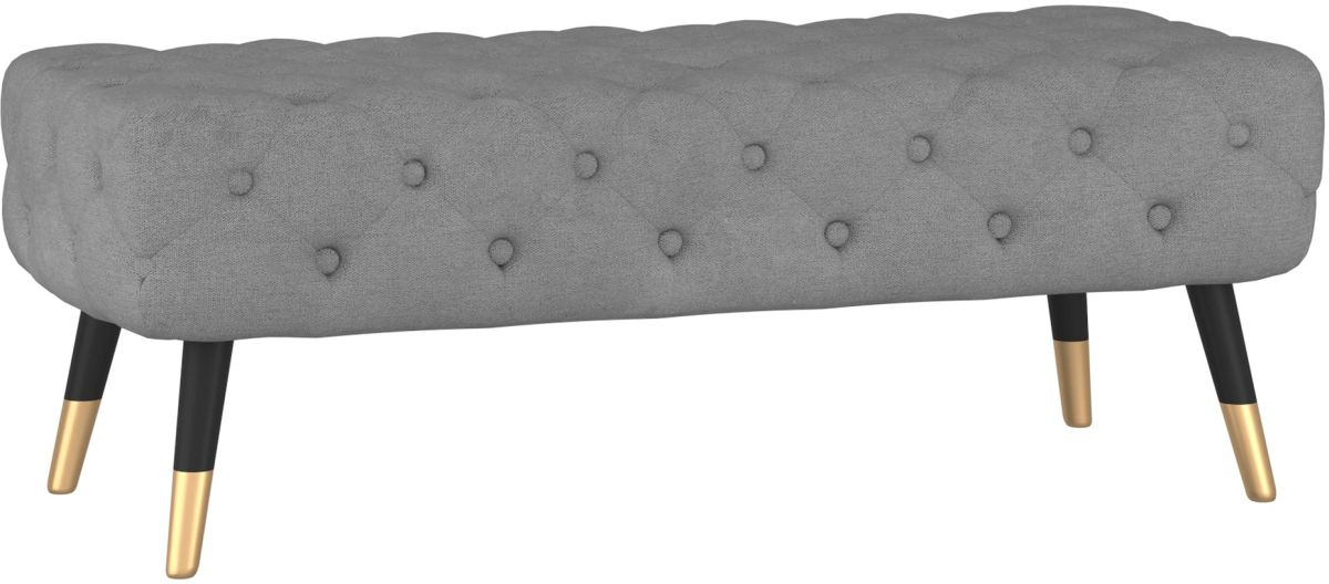Gorgeous tufted bench with button details. This bench is great for formal living spaces, in an entryway, or at the end of the bed. Versatile and beautiful with soft textured fabric upholstery, this piece is comfortable as well. The finishing touch is the aged gold-dipped painted legs - elevate your style profile and your home.Read More