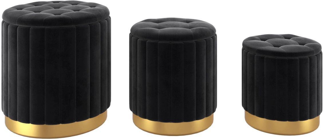 Give everyone a chance to put their feet up and relax with this 3-piece ottoman set. Each piece has it's own ample storage space, perfect for stashing throw blankets, game remotes, books, etc. Smaller pieces all nest inside the larger one so it's quick and easy to declutter when you want. Simply pull out and spread around the room as required. The beautiful vertical tufting and velvet upholstery is paired perfectly with the shiny gold stainless steel base - a sparkling finish!Read More