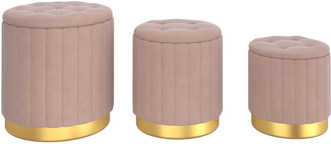 Give everyone a chance to put their feet up and relax with this 3-piece ottoman set. Each piece has it's own ample storage space, perfect for stashing throw blankets, game remotes, books, etc. Smaller pieces all nest inside the larger one so it's quick and easy to declutter when you want. Simply pull out and spread around the room as required. The beautiful vertical tufting and velvet upholstery is paired perfectly with the shiny gold stainless steel base - a sparkling finish!Read More